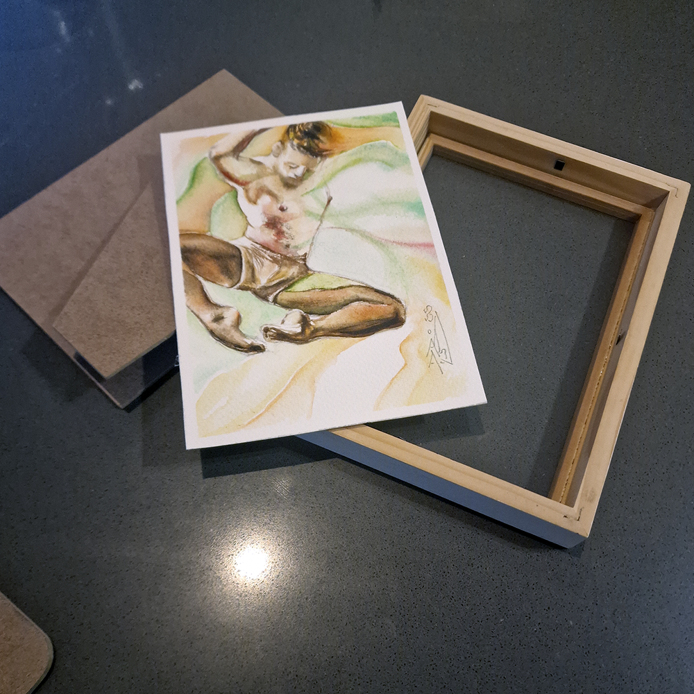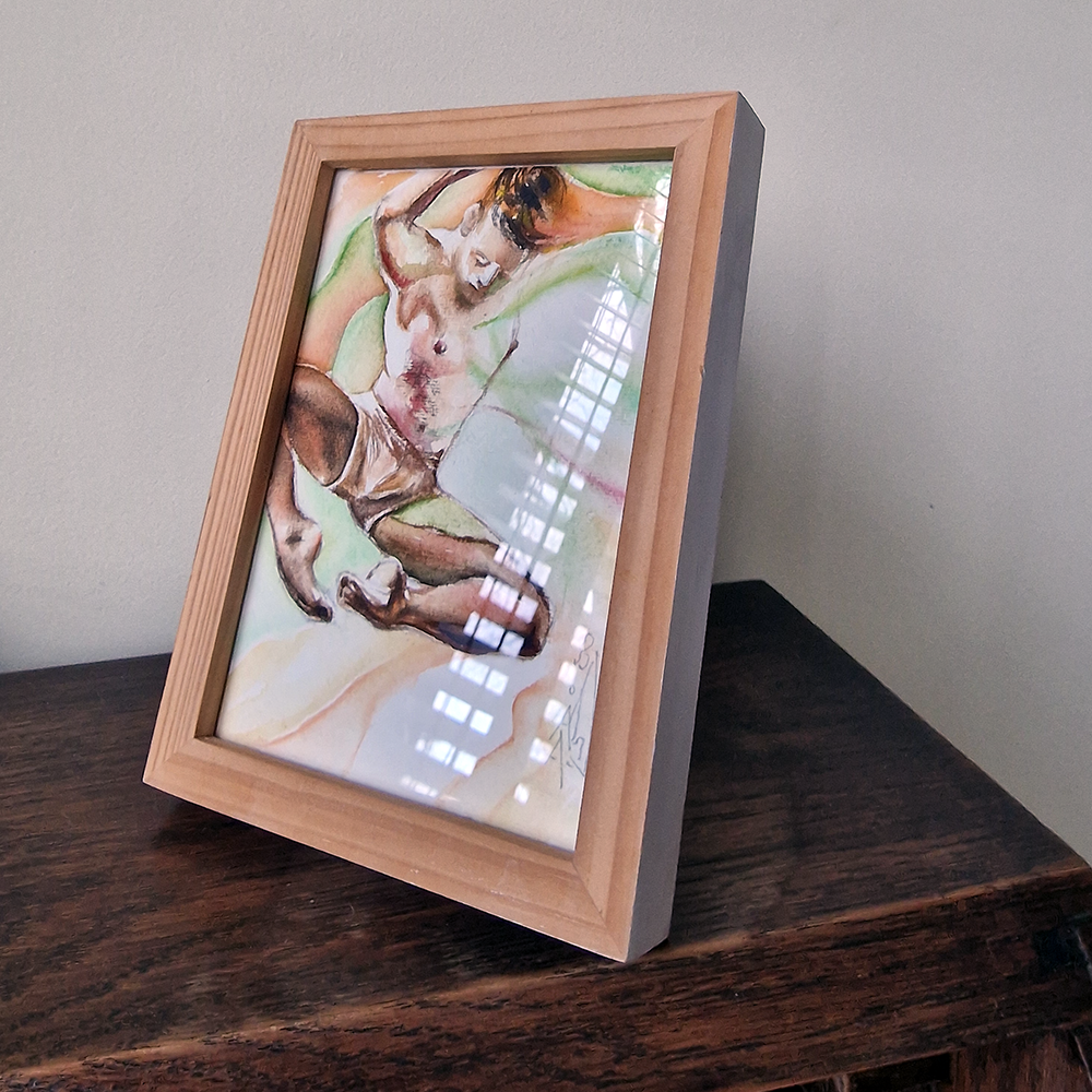 This is an original (no print) watercolor small size painting of a male figure on white paper. Framed.