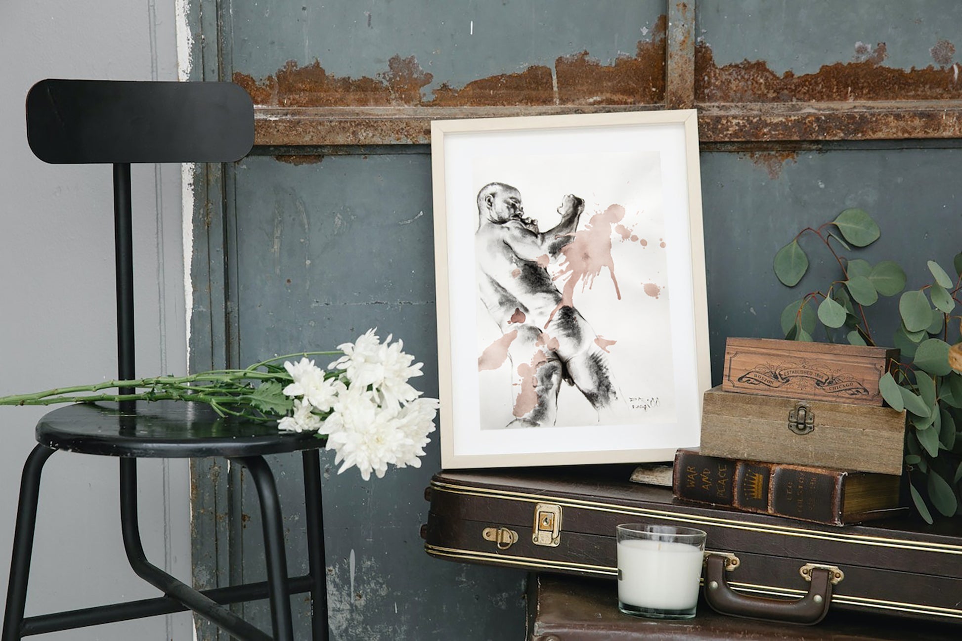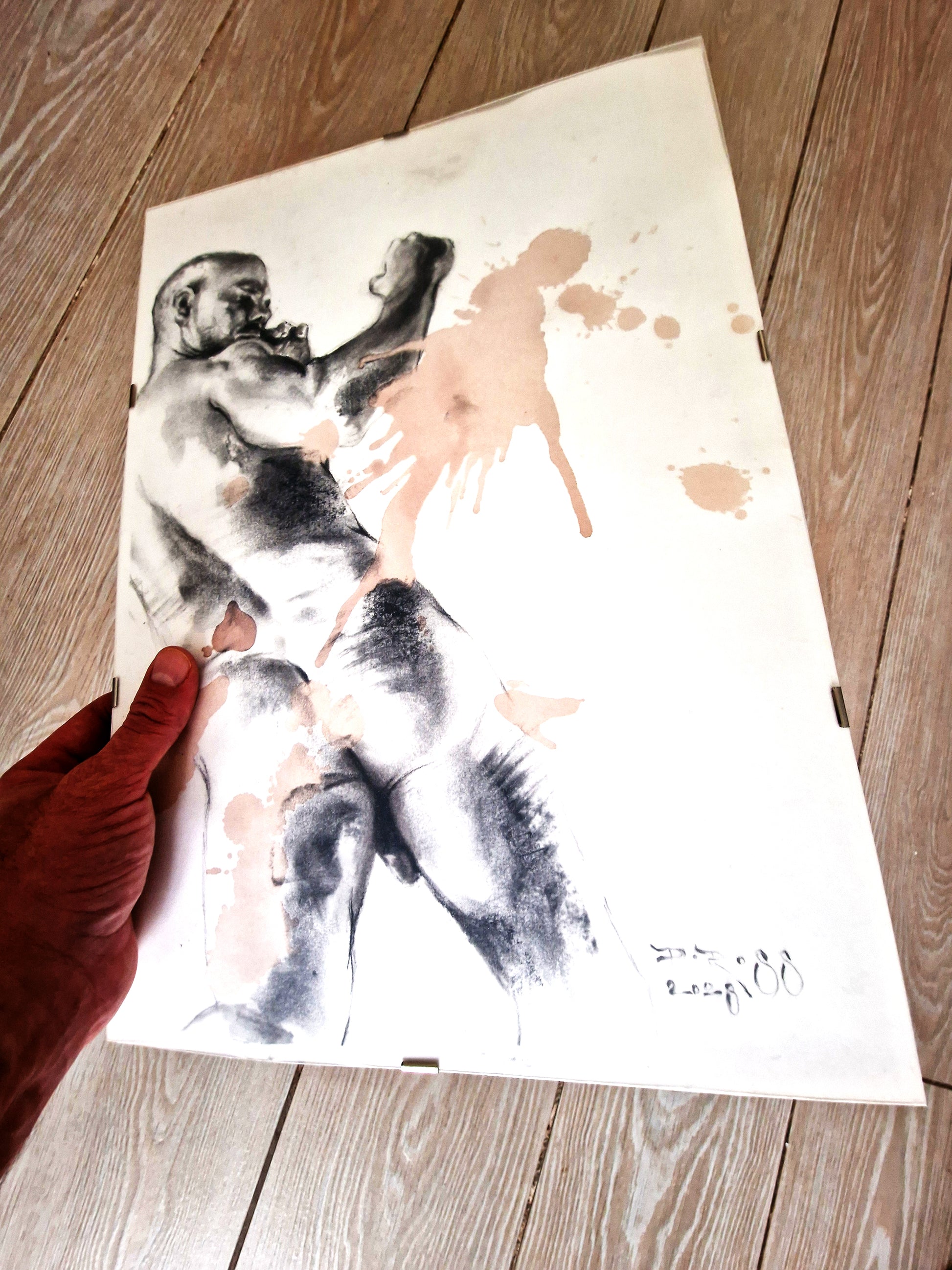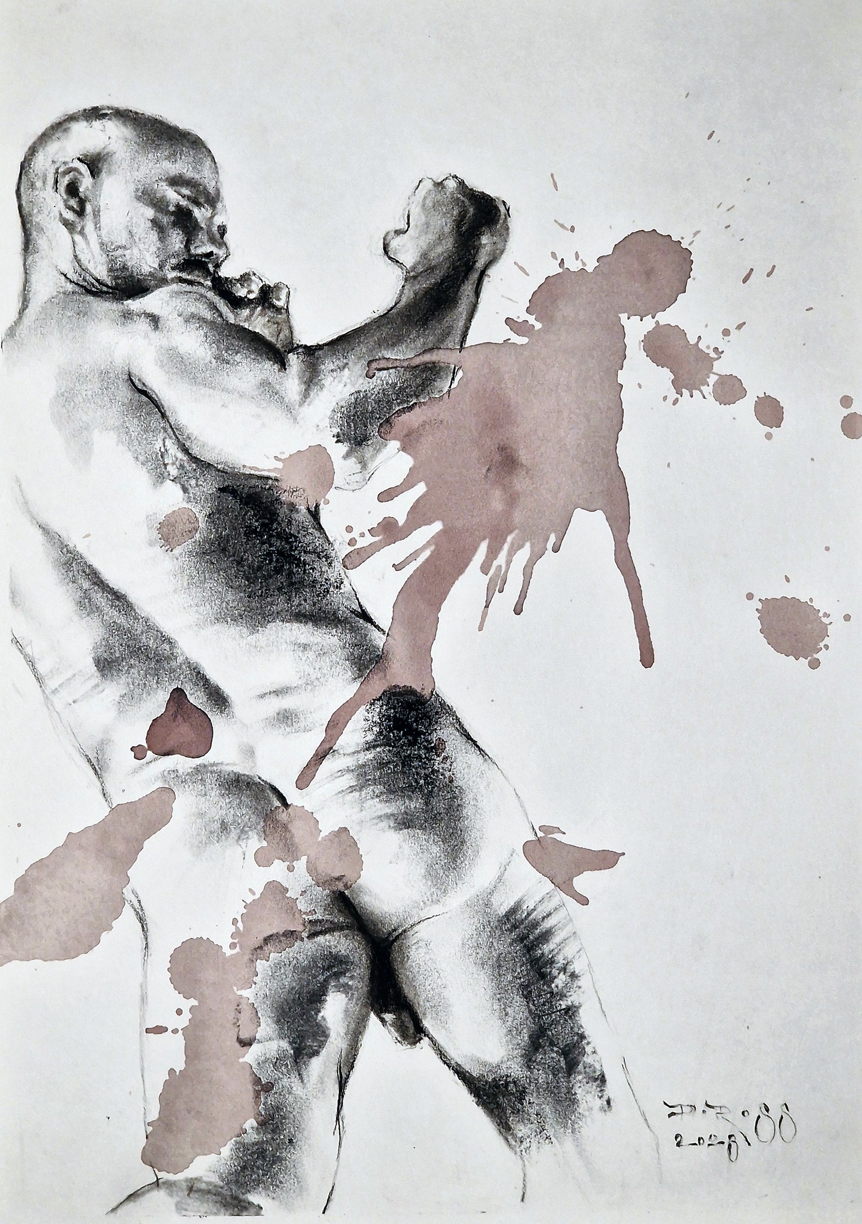 The pose of the male figure and the red translucent spots on the paper add atmosphere and dynamics to this drawing.