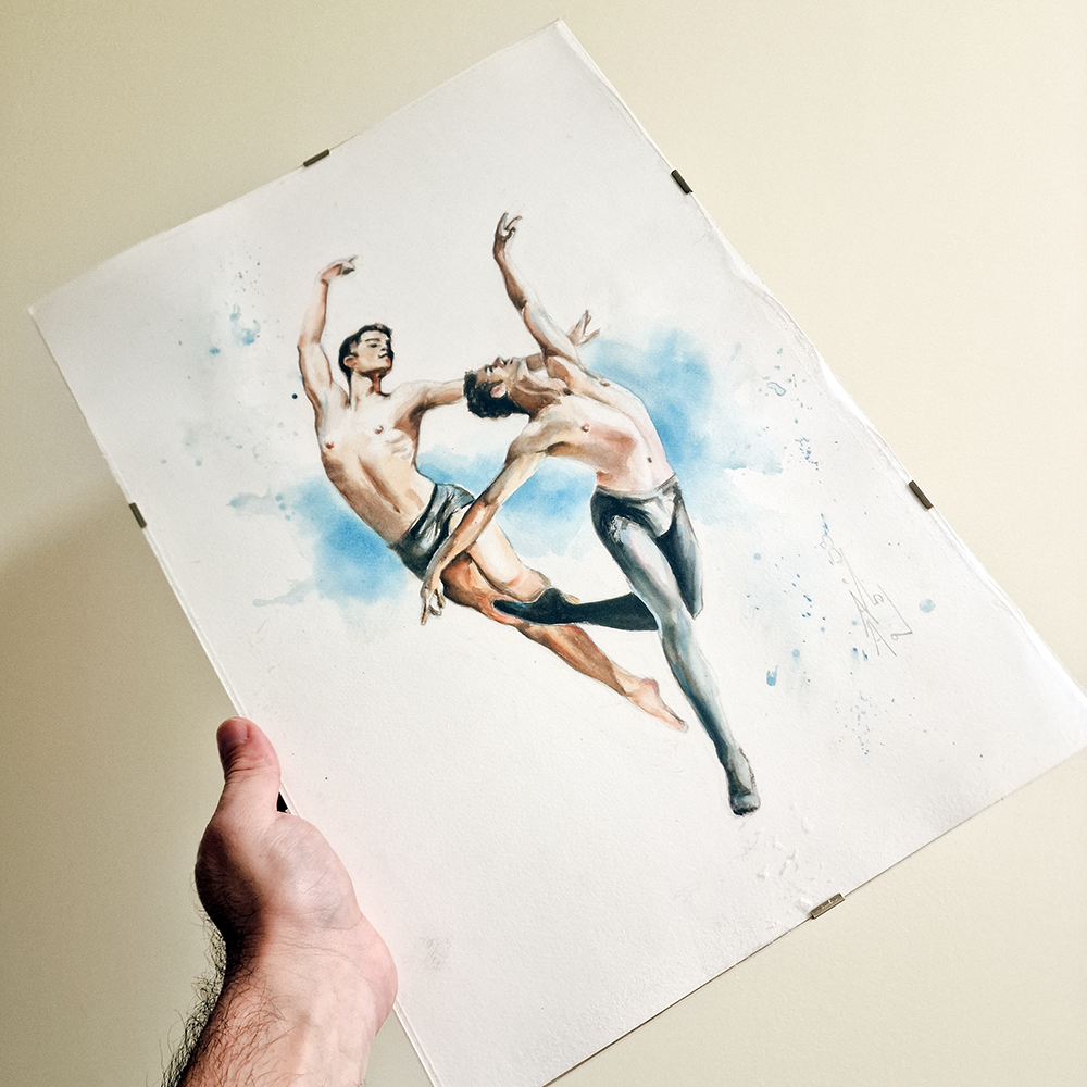 Depicted are two young athletic men in ballet dance poses, one dancer is wearing short shorts, the other one has the long black tights. The figures are surrounded by abstract watercolor wash in blue.