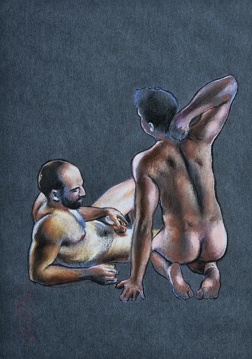 Depicted are two men. One man is lying down, while the other man is kneeling in front of him. The overall tone is dark because of the dark-grey paper, with the figures in light colors creating a unique atmosphere. The focus is on form and anatomy of the lower back of the kneeling figure.