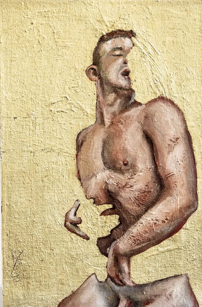 This is an original small-size oil painting on cavas board with gilding (composition gold leaf).